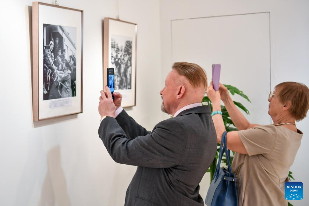 People take photos while visiting a photo exhibition marking the 80th anniversary of the victory of the Chinese People's War of Resistance Against Japanese Aggression and the World Anti-Fascist War at the China Cultural Center in Moscow, Russia, June 5, 2025. (Xinhua/Cao Yang)