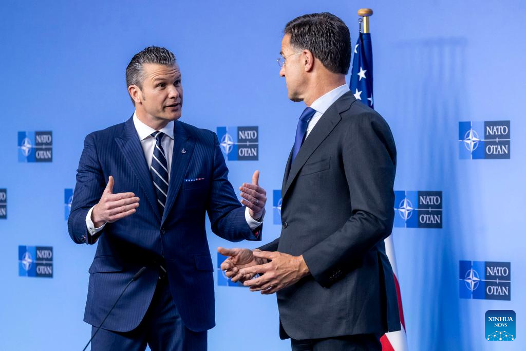 U.S. Defense Secretary Pete Hegseth (L) and NATO Secretary General Mark Rutte meet the press during the NATO defense ministers meeting at the NATO headquarters in Brussels, Belgium, on June 5, 2025. NATO defense ministers meeting in Brussels on Thursday "broadly" agreed to pursue a significant increase in member states' military spending to 5 percent of GDP. However, sharp disagreements over the timeline and spending categories revealed deep divisions ahead of the alliance's upcoming summit in The Hague, scheduled for June 24-25. (NATO/Handout via Xinhua)
