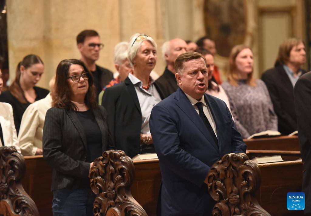 Austrian Chancellor Christian Stocker (2nd L) attends a memorial ceremony at a church in Graz, Austria, on June 10, 2025. At least 10 people were killed in a school shooting in Austria's second-largest city of Graz, local media reported on Tuesday. (Xinhua/He Canling)