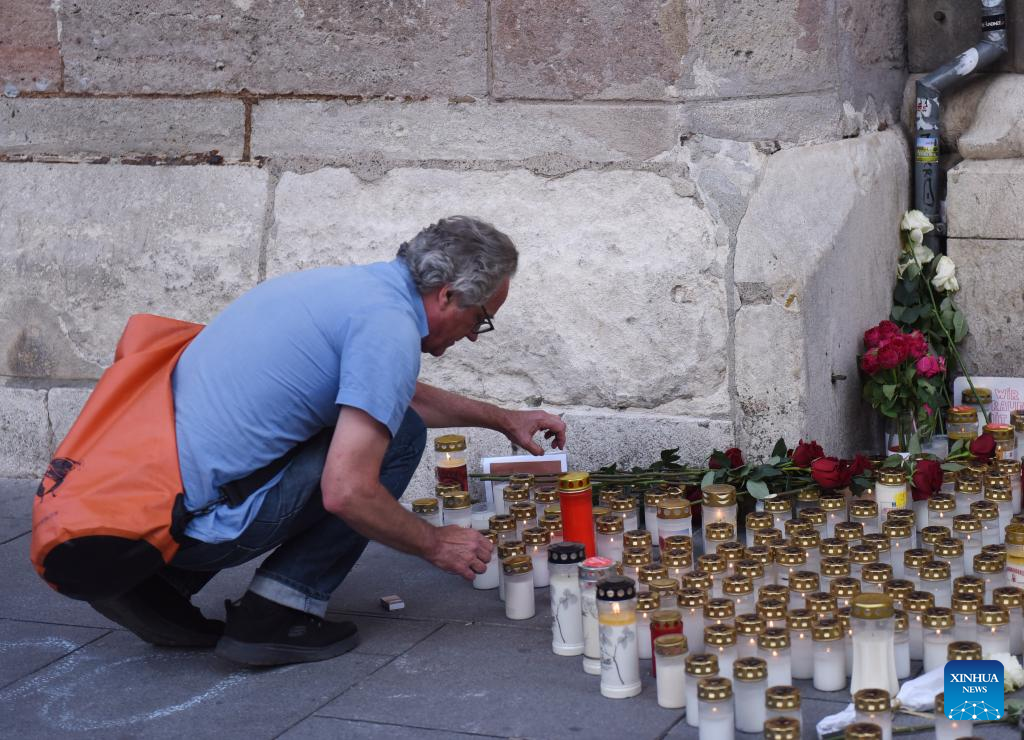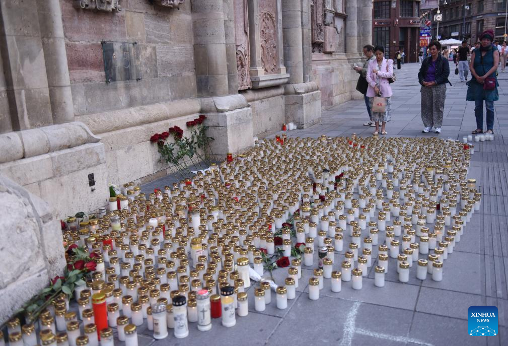 People lay candles to mourn victims killed in a mass school shooting in Stephansplatz in Vienna, Austria, on June 11, 2025. (Photo by Han Lu/Xinhua)