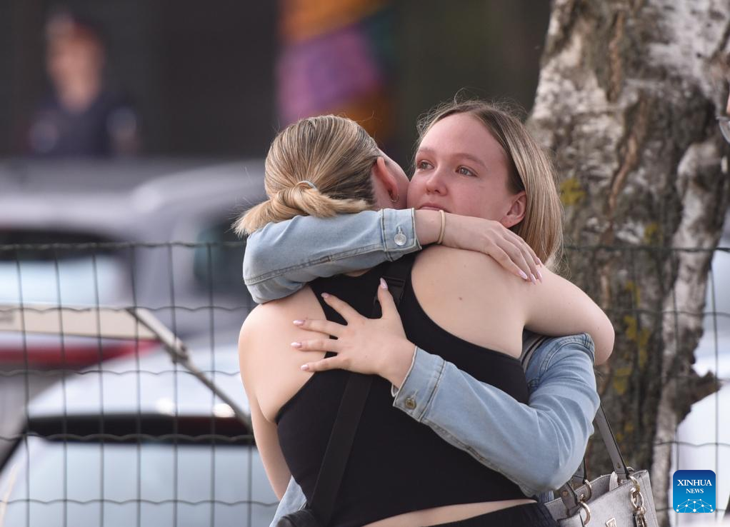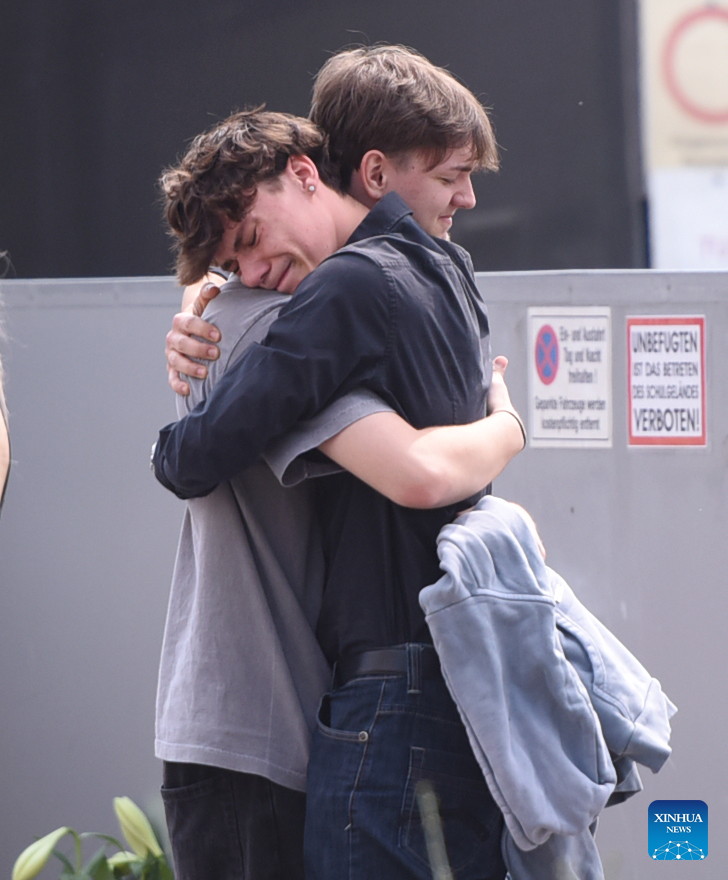 People hug while attending a memorial service in front of a school where a shooting occurred in Graz, Austria, June 11, 2025. (Xinhua/He Canling)