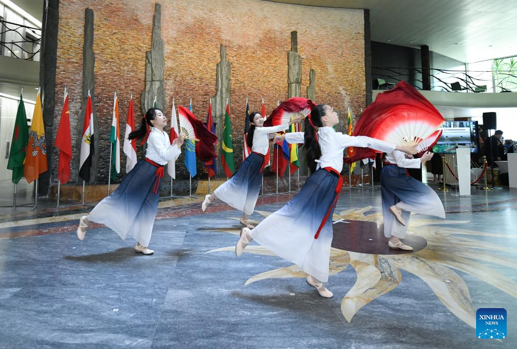 Performers from China present traditional Chinese fan dance during the fifth Asia Culture Festival at the World Intellectual Property Organization (WIPO) headquarters in Geneva, Switzerland, June 11, 2025. The fifth Asia Culture Festival was held on Wednesday at the WIPO headquarters in Geneva, under the theme "Jewels of Asia."
