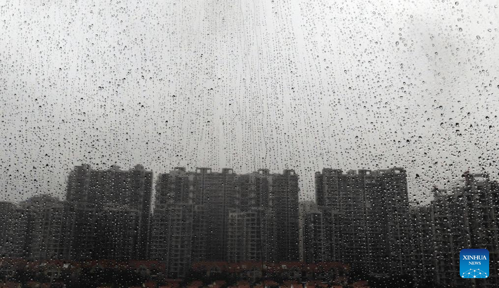 This photo taken on June 14, 2025 shows raindrops on the glass during heavy rainfall in Beihai City, south China's Guangxi Zhuang Autonomous Region. Multiple Chinese authorities convened on Saturday to put in place precautionary measures against Typhoon Wutip, the first typhoon of the year, which is expected to bring heavy rainfall to the southern parts of the country. (Xinhua/Zhang Ailin)