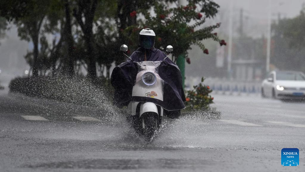A citizen rides amid heavy rainfall in Beihai City, south China's Guangxi Zhuang Autonomous Region, June 14, 2025. Multiple Chinese authorities convened on Saturday to put in place precautionary measures against Typhoon Wutip, the first typhoon of the year, which is expected to bring heavy rainfall to the southern parts of the country. (Xinhua/Zhang Ailin)