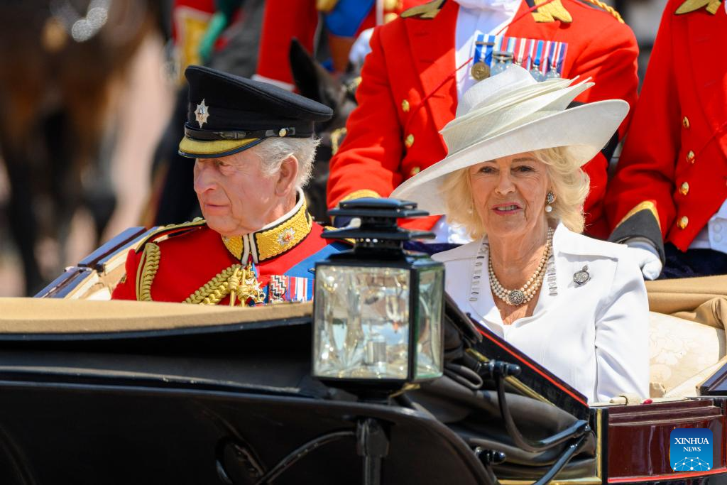 Britain's King Charles III and Queen Camilla attend the Trooping the Colour parade to honour Britain's King Charles III on his official birthday in London, Britain, on June 14, 2025. (Photo by Ray Tang/Xinhua)