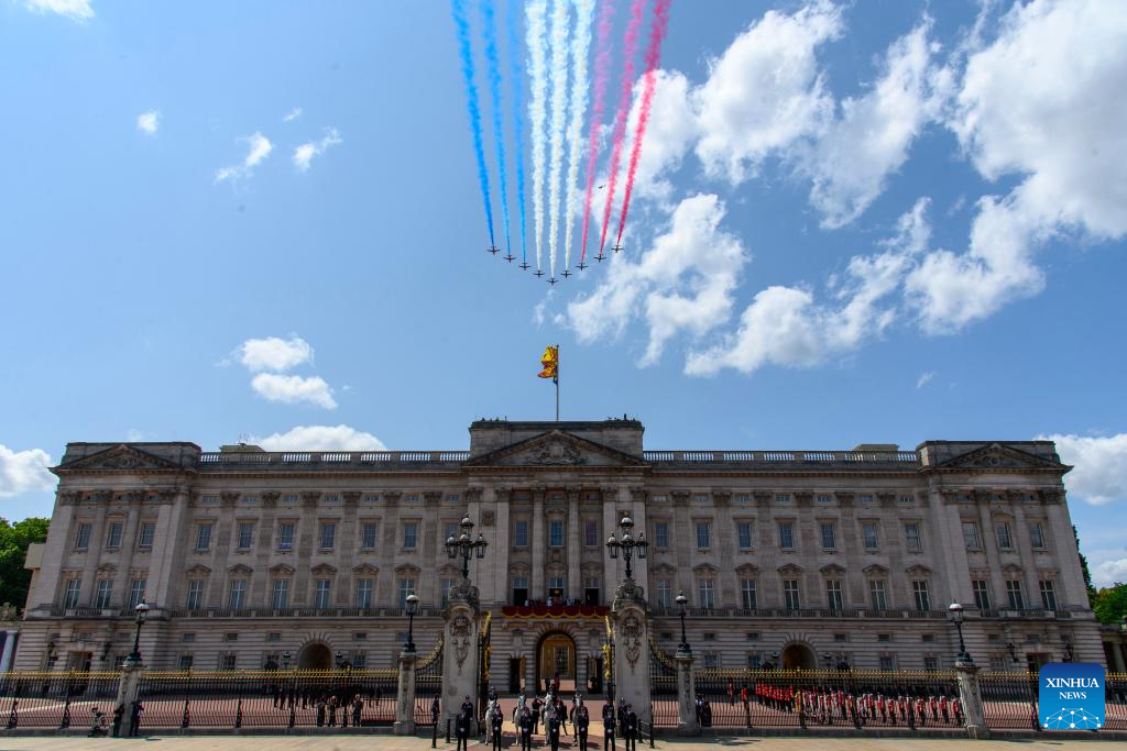 A flypast is seen during the Trooping the Colour parade to honour Britain's King Charles III on his official birthday in London, Britain, on June 14, 2025. (Photo by Ray Tang/Xinhua)