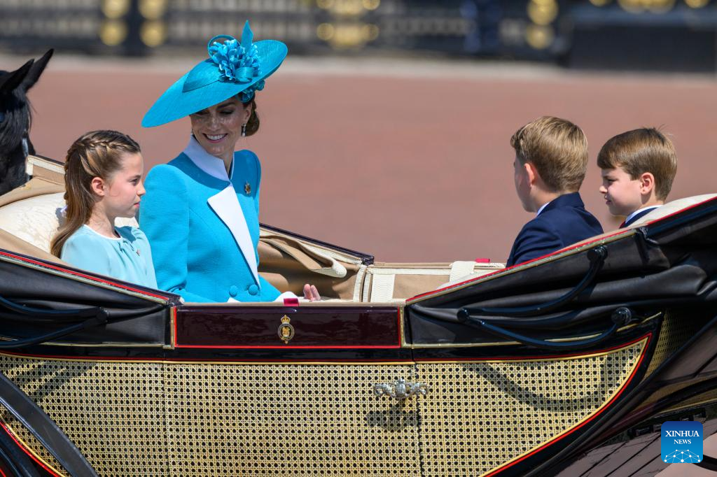 Britain's Catherine, Princess of Wales, rides a royal carriage with Prince George, Princess Charlotte and Prince Louis, during the Trooping the Colour parade to honour Britain's King Charles III on his official birthday in London, Britain, on June 14, 2025. (Photo by Ray Tang/Xinhua)