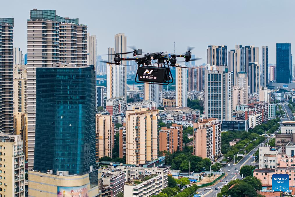 An aerial drone photo taken on June 16, 2025 shows a logistic drone flying in Wuhan, central China's Hubei Province. Ten new drone routes linking Wuchang, Hankou and Hanyang in Wuhan were officially put into operation on Monday. The low-altitude flying service consists of a digital real-time dispatching platform, 2 smart command centers, 10 low-altitude routes and 22 intelligent aprons. It facilitates the delivery of goods such as seafood, fresh flowers and medicines. (Xinhua/Wu Zhizun)