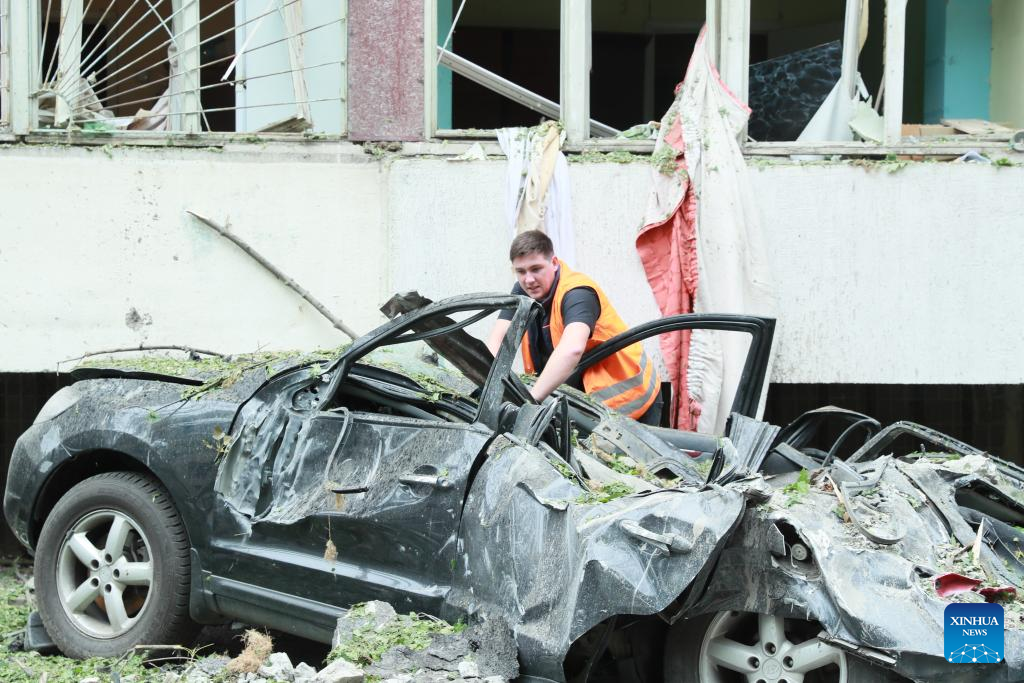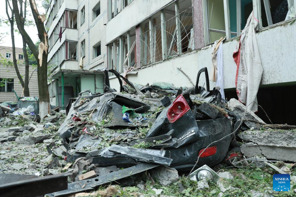 Debris is pictured near a destroyed building after a Russian missile attack in Kiev, Ukraine, June 17, 2025. (Xinhua/Li Dongxu)