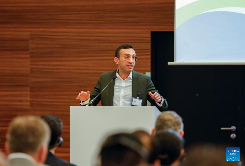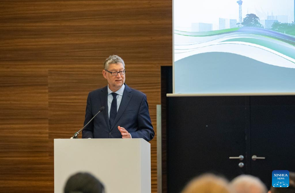 Thorsten Schaefer-Guembel, chair of the Management Board of Deutsche Gesellschaft für Internationale Zusammenarbeit (GIZ), addresses the first German-Chinese City Summit in Frankfurt, Germany, June 17, 2025. (Xinhua/Zhang Fan)
