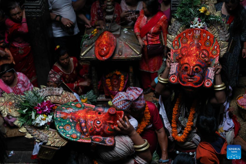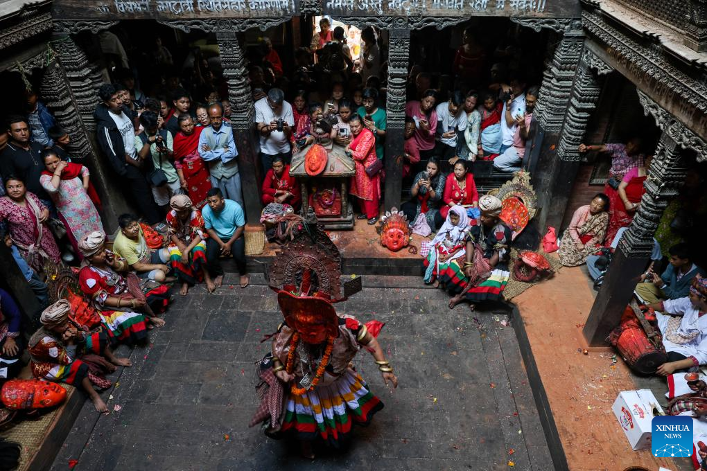 People gather for a traditional Navadurga dance performance in Bhaktapur, Nepal, June 18, 2025. Navadurga means nine forms of goddess Durga. (Photo by Sulav Shrestha/Xinhua)
