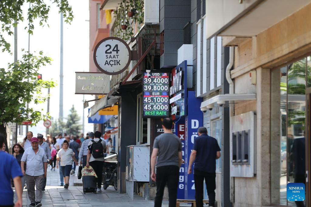 People pass by a currency exchange office in Ankara, Türkiye, on June 19, 2025. The Central Bank of Türkiye kept its policy rate unchanged at 46 percent on Thursday, in line with market expectations. (Mustafa Kaya/Handout via Xinhua)