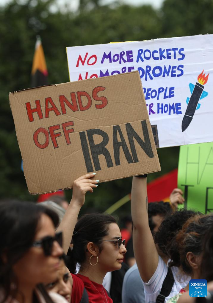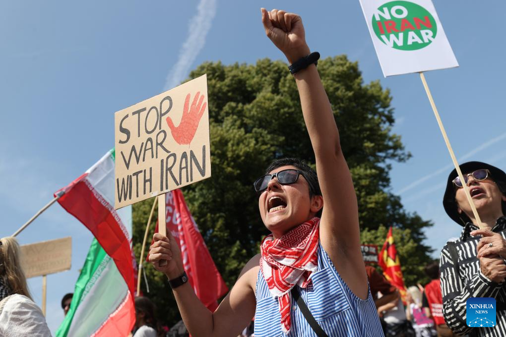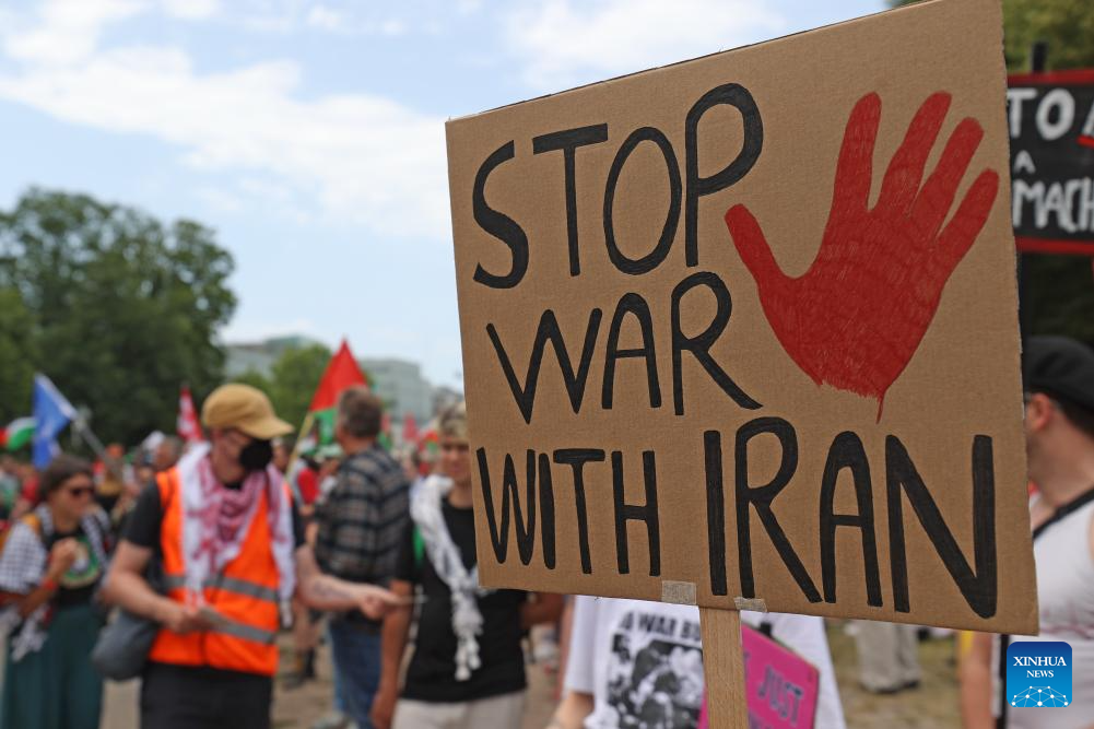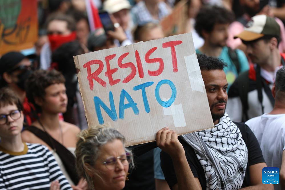 The protest, attended by hundreds, took place two days before the NATO summit, where member states are expected to push for increased defense spending. While the demonstration was billed as opposing NATO and the war in Gaza, it also drew participants holding banners reading "No Iran War," following U.S. airstrikes on three of Iran's nuclear facilities a day earlier.(Xinhua/Peng Ziyang)