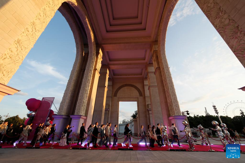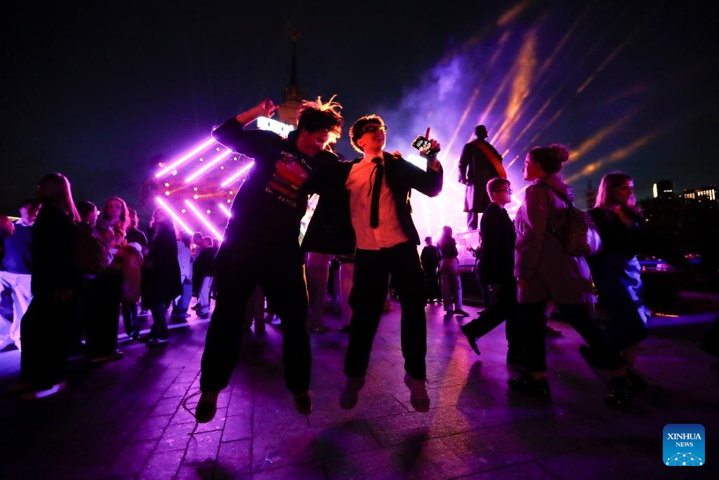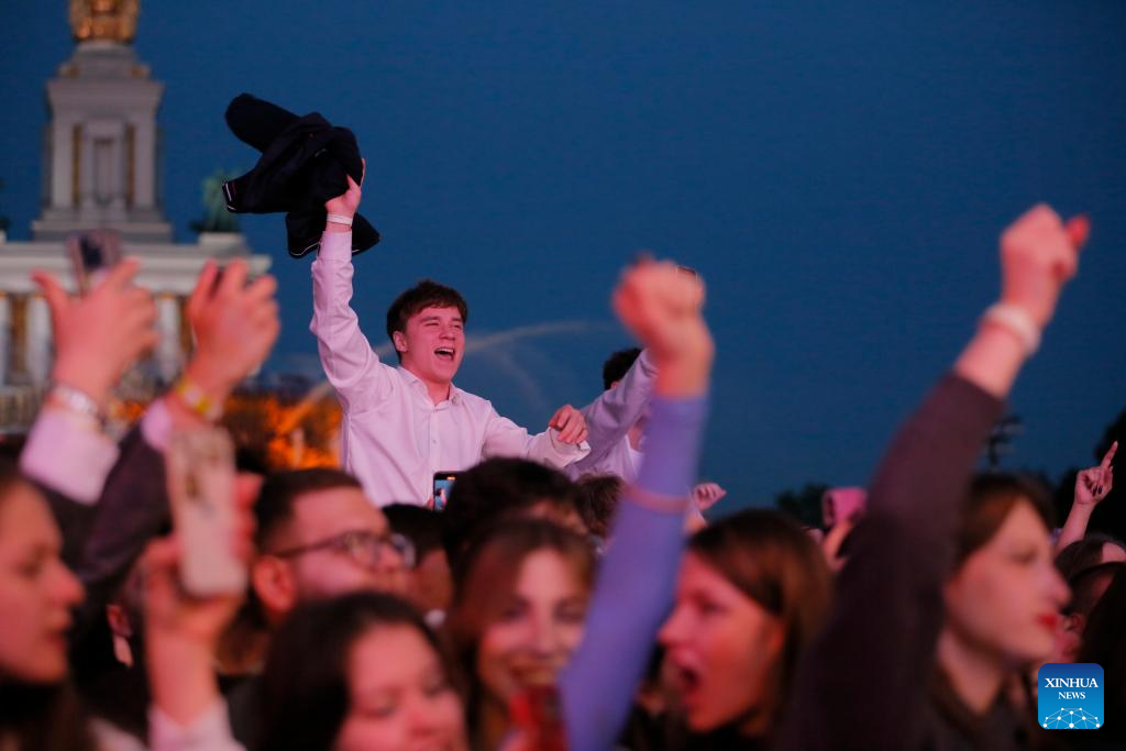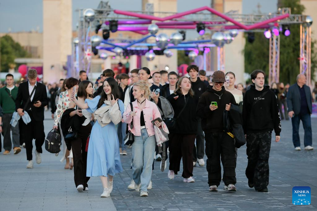 Secondary school graduates participate in a graduation party at the Exhibition of Achievements of National Economy in Moscow, Russia, on June 27, 2025. An outdoor party was held here for secondary school graduates on Friday. (Photo by Alexander Zemlianichenko Jr/Xinhua)