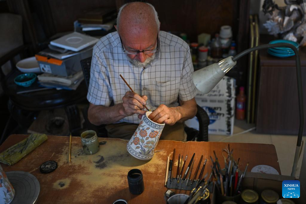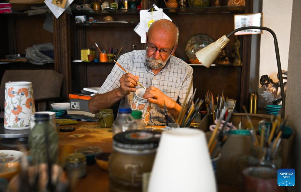 Master artisan Adil Can Guven works at his studio in Iznik, Türkiye, on June 26, 2025. In the historic town of Iznik in northwestern Türkiye, renowned for its centuries-old ceramic tradition, master artisan Adil Can Guven is devoted to preserving and revitalizing this ancient craft. (Xinhua/Liu Lei)