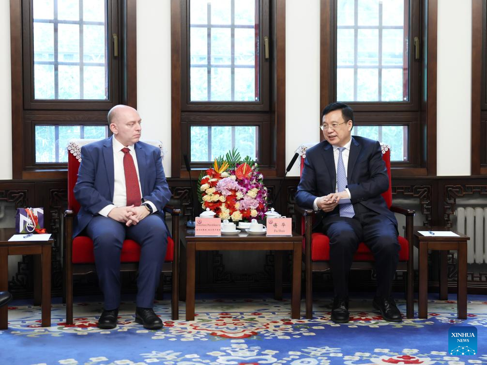 President of Xinhua News Agency Fu Hua meets with Aimilios Perdikaris, chairman of the board and general manager at Athens-Macedonian News Agency, in Beijing, capital of China, June 30, 2025. (Xinhua/Ding Haitao)
