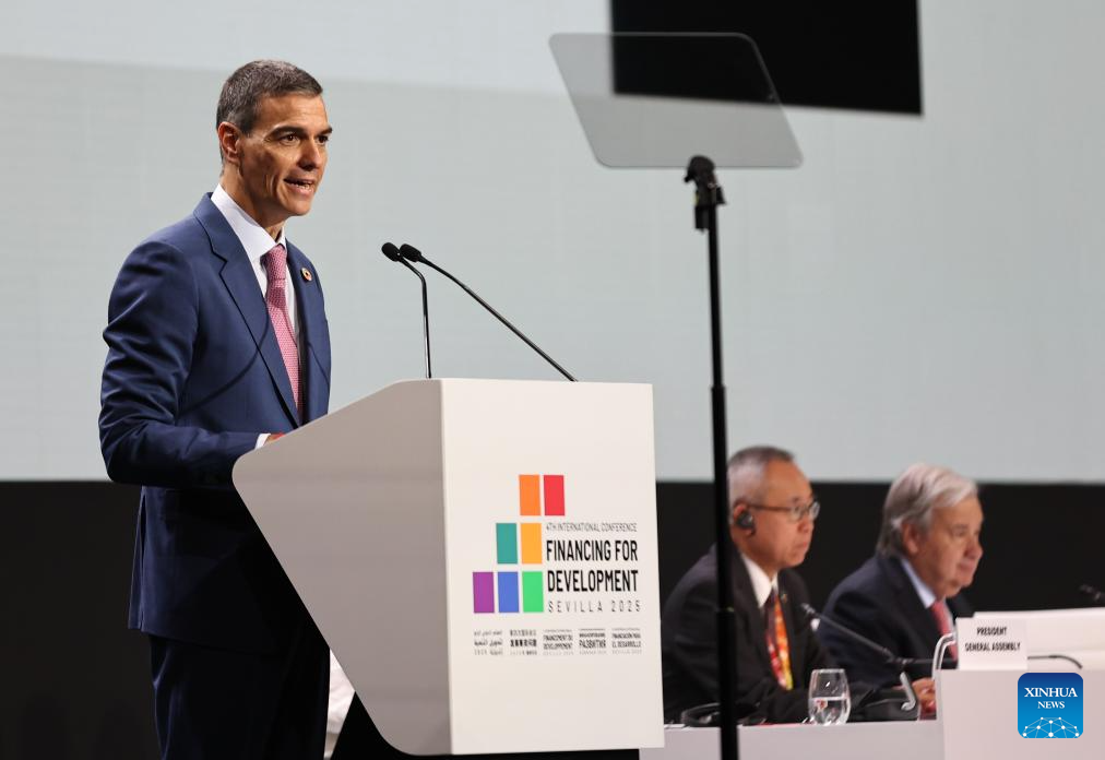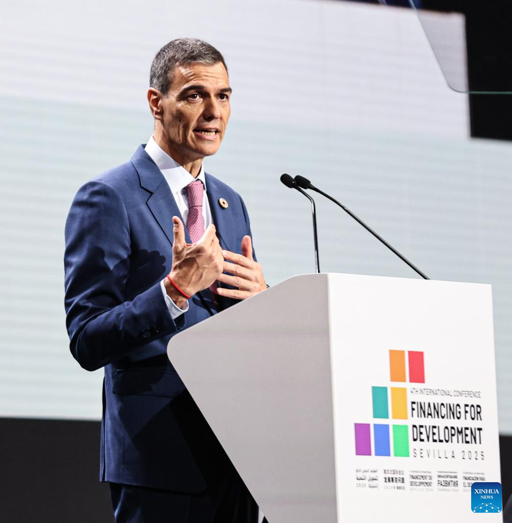 Spanish Prime Minister Pedro Sanchez speaks during the opening session of the fourth International Conference on Financing for Development in Seville, Spain, June 30, 2025. The fourth International Conference on Financing for Development, focusing on global development financing issues, took place from Monday and will continue through Thursday, with participation from representatives of governments, international organizations, financial institutions, business communities, among others. (Xinhua/Li Jing)