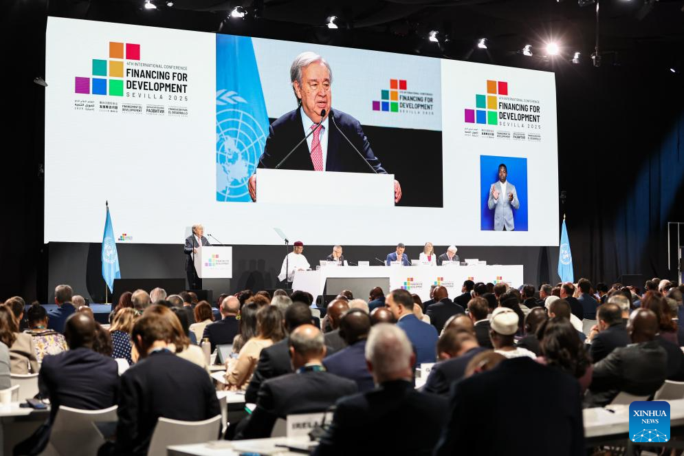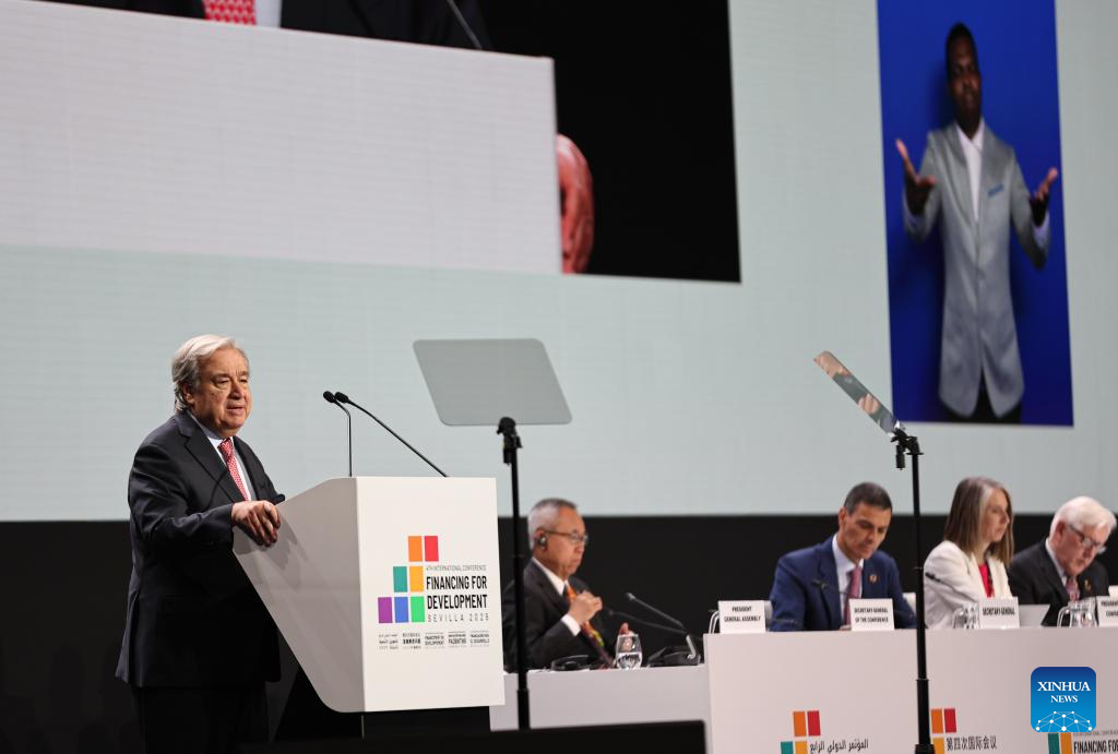 UN Secretary-General Antonio Guterres speaks during the opening session of the fourth International Conference on Financing for Development in Seville, Spain, June 30, 2025. The fourth International Conference on Financing for Development, focusing on global development financing issues, took place from Monday and will continue through Thursday, with participation from representatives of governments, international organizations, financial institutions, business communities, among others. (Xinhua/Li Jing)