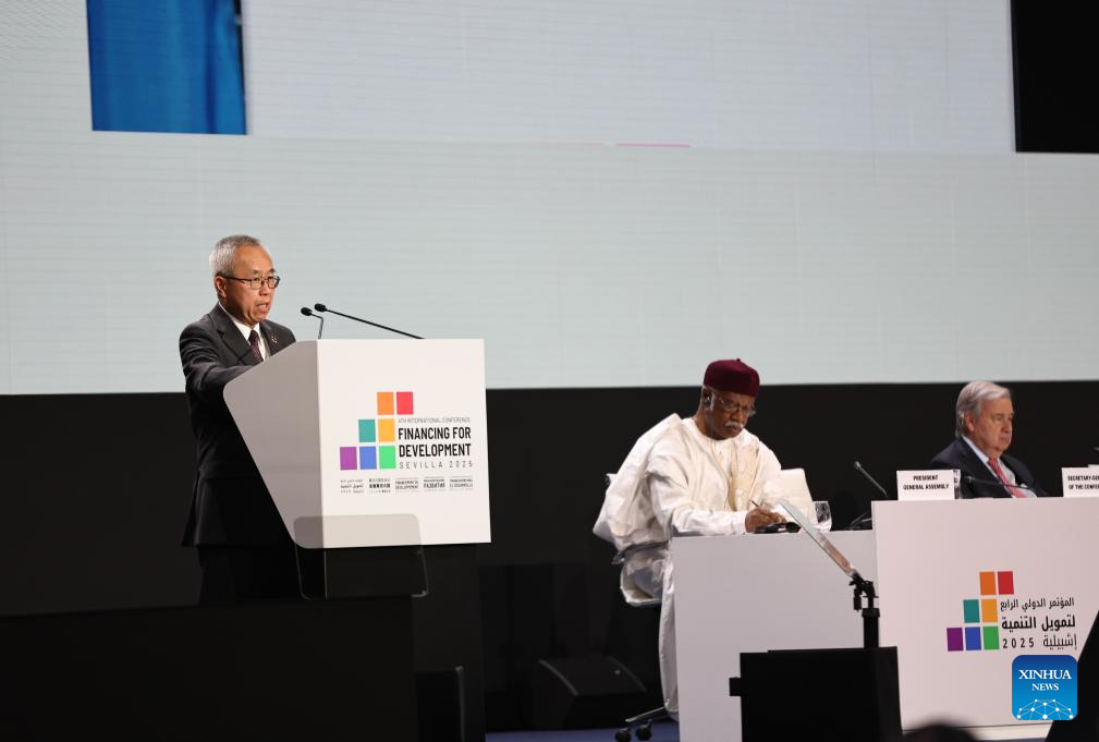 UN Under-Secretary-General Li Junhua speaks during the opening session of the fourth International Conference on Financing for Development in Seville, Spain, June 30, 2025. The fourth International Conference on Financing for Development, focusing on global development financing issues, took place from Monday and will continue through Thursday, with participation from representatives of governments, international organizations, financial institutions, business communities, among others. (Xinhua/Li Jing)