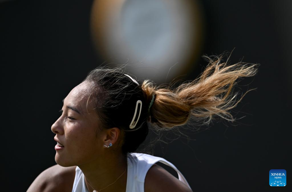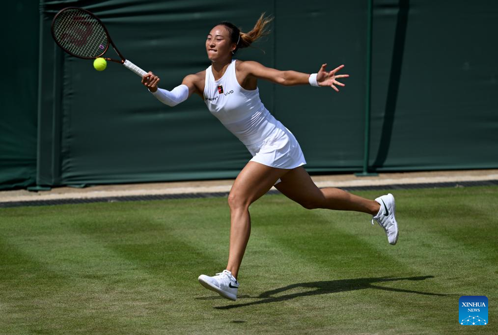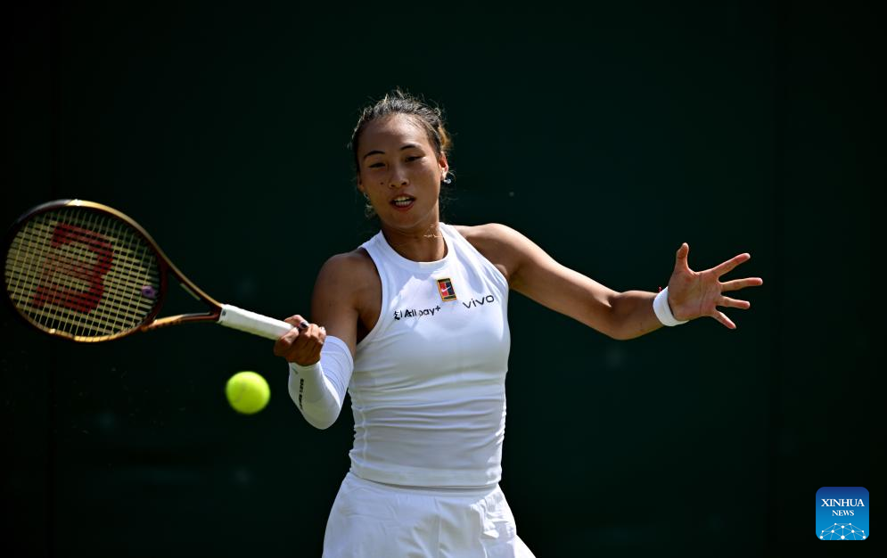 Zheng Qinwen hits a return during the women's singles first round match between Zheng Qinwen of China and Katerina Siniakova of the Czech Republic at the Wimbledon Tennis Championships in London, Britain, July 1, 2025. (Xinhua/Li Ying)