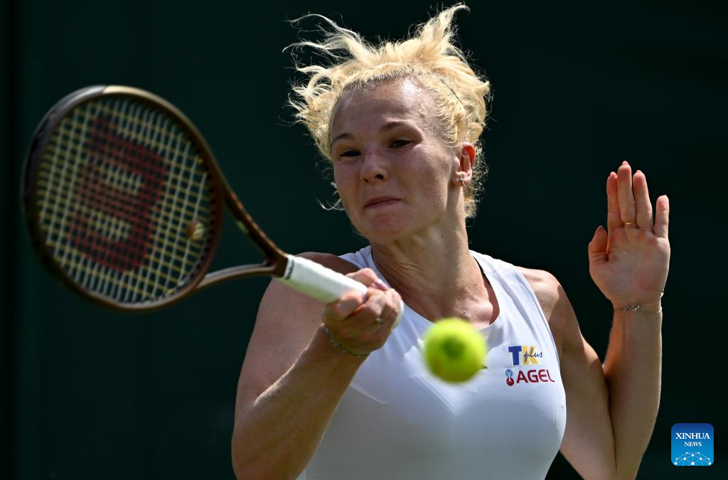 Katerina Siniakova hits a return during the women's singles first round match between Zheng Qinwen of China and Katerina Siniakova of the Czech Republic at the Wimbledon Tennis Championships in London, Britain, July 1, 2025. (Xinhua/Li Ying)