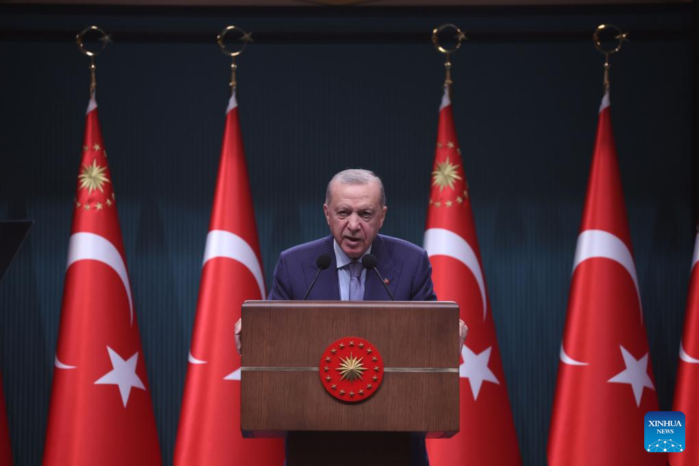Turkish President Recep Tayyip Erdogan speaks at a press conference following a cabinet meeting in Ankara, Türkiye, on June 30, 2025. Türkiye will host the 2026 NATO leaders' summit in its capital Ankara, Erdogan said on Monday. (Mustafa Kaya/Handout via Xinhua)