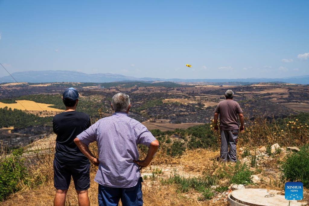 Local residents watch a firefighting plane in Lleida province, Spain, July 2, 2025. (Photo by Joan Gosa/Xinhua)