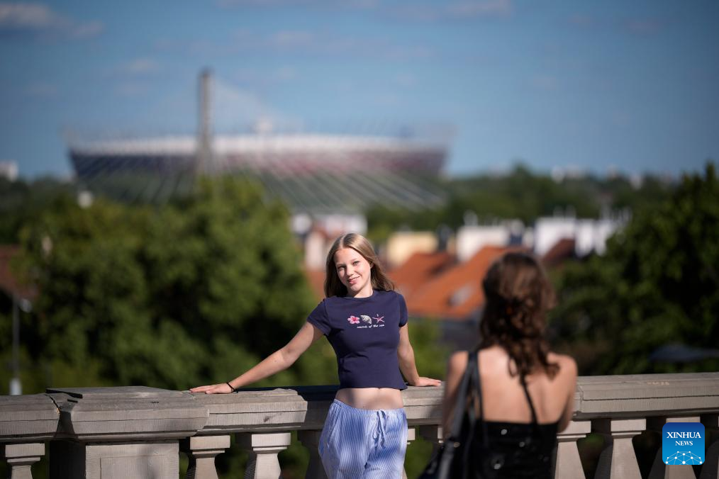 A visitor poses for a photo at the Old Town in Warsaw, Poland, on July 1, 2025. Poland's meteorological authorities have issued heat warnings for much of the country this week. (Photo by Jaap Arriens/Xinhua)