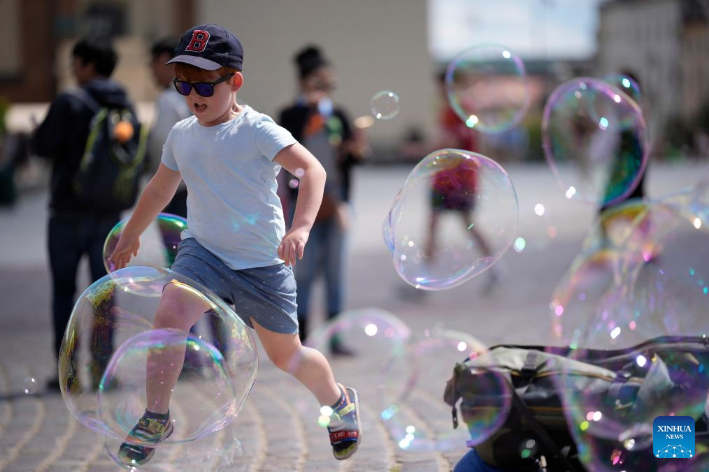 A child plays with floating soap bubbles at the Royal Castle Square in Warsaw, Poland, on July 1, 2025. Poland's meteorological authorities have issued heat warnings for much of the country this week. (Photo by Jaap Arriens/Xinhua)