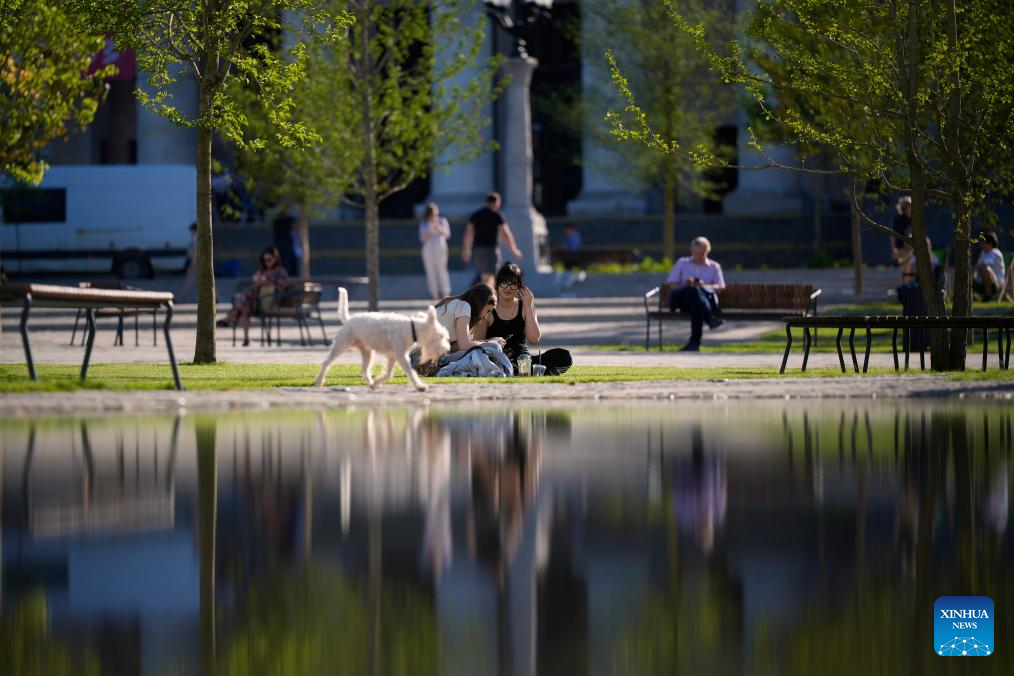 People relax by a shallow pool at a public park in Warsaw, Poland, on July 1, 2025. Poland's meteorological authorities have issued heat warnings for much of the country this week. (Photo by Jaap Arriens/Xinhua)