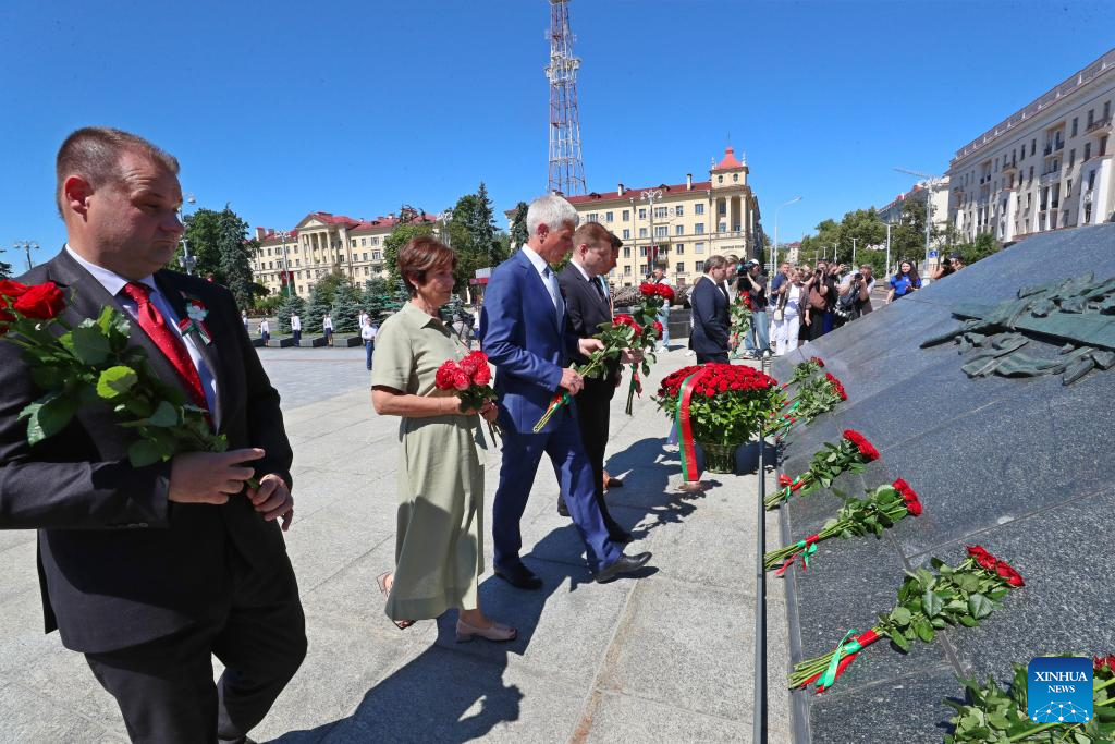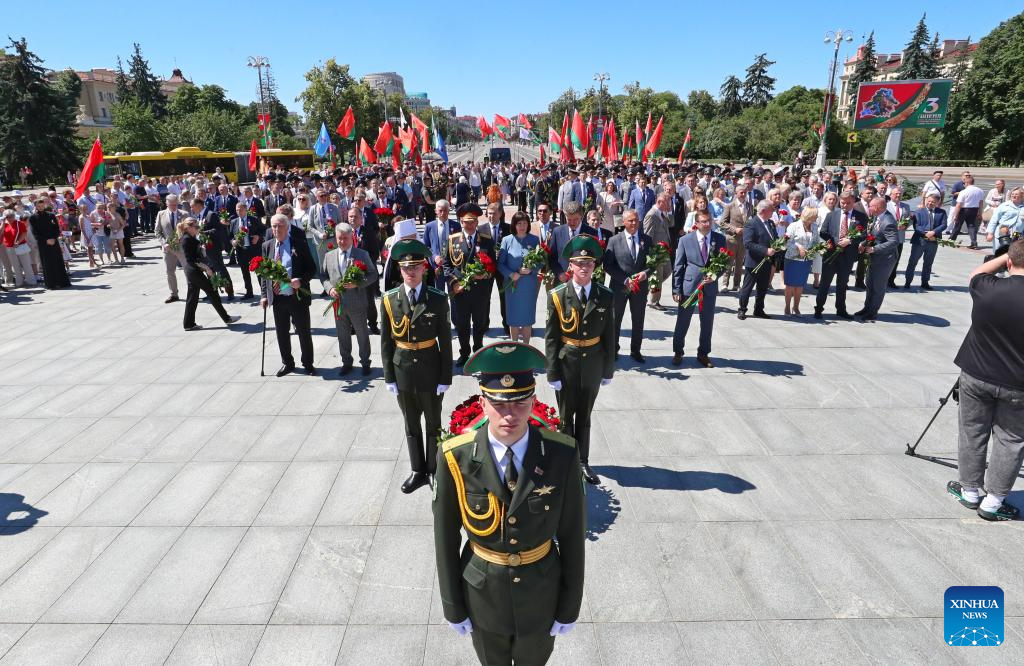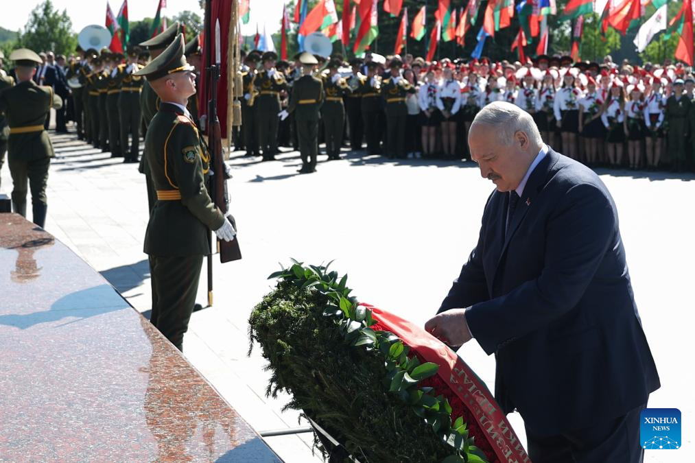 Belarusian President Alexander Lukashenko (front) lays a wreath during an event marking Belarus Independence Day at the Mound of Glory memorial complex outside Minsk, Belarus, on July 3, 2025. Belarus celebrated its most important national holiday on Thursday, commemorating a significant historical moment of liberation during World War II. (Press Service of the President of the Republic of Belarus/Handout via Xinhua)