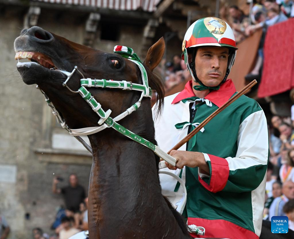 Palio jockeys compete during the Palio in Siena, Italy, July 3, 2025. Palio in Siena, or "Palio di Siena" in Italian, is a historical horse race held twice a year in Siena since 1656. (Photo by Alberto Lingria/Xinhua)