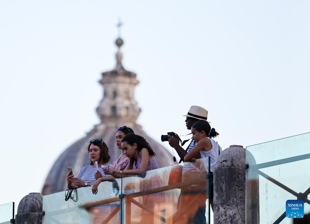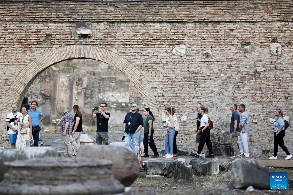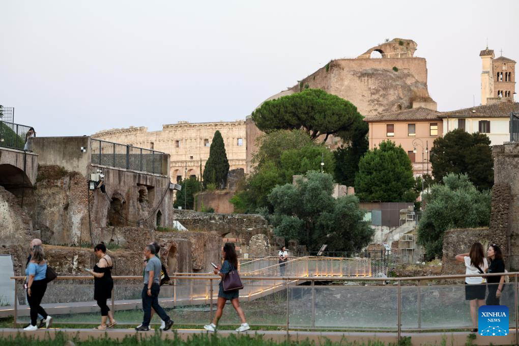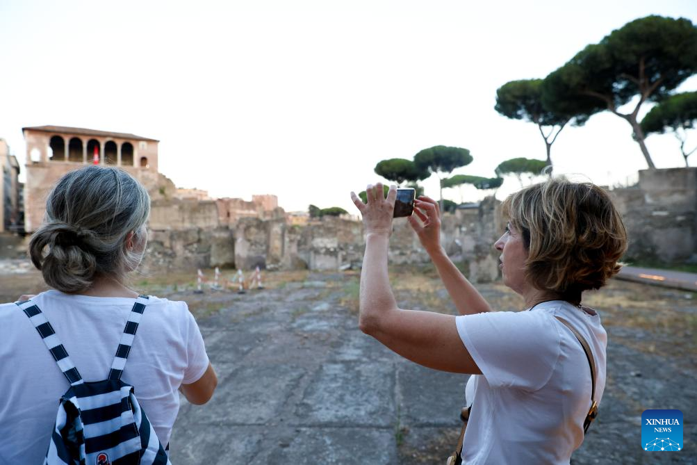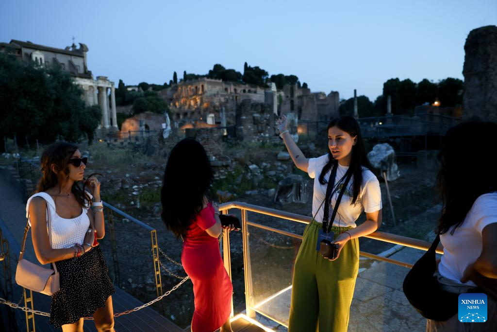 Tourists visit the Imperial Forum during a night tour in Rome, Italy, July 5, 2025. The Imperial Forum has opened to visitors on every Friday, Saturday and Sunday evening since June 20 and will last until September 28. (Xinhua/Li Jing)