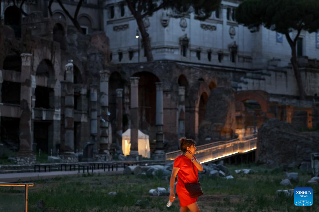 A woman visits the Imperial Forum during a night tour in Rome, Italy, July 5, 2025. The Imperial Forum has opened to visitors on every Friday, Saturday and Sunday evening since June 20 and will last until September 28. (Xinhua/Li Jing)