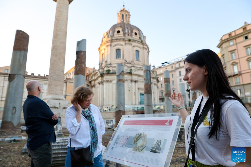 A tour guide speaks during a night tour at the Imperial Forum in Rome, Italy, July 5, 2025. The Imperial Forum has opened to visitors on every Friday, Saturday and Sunday evening since June 20 and will last until September 28. (Xinhua/Li Jing)