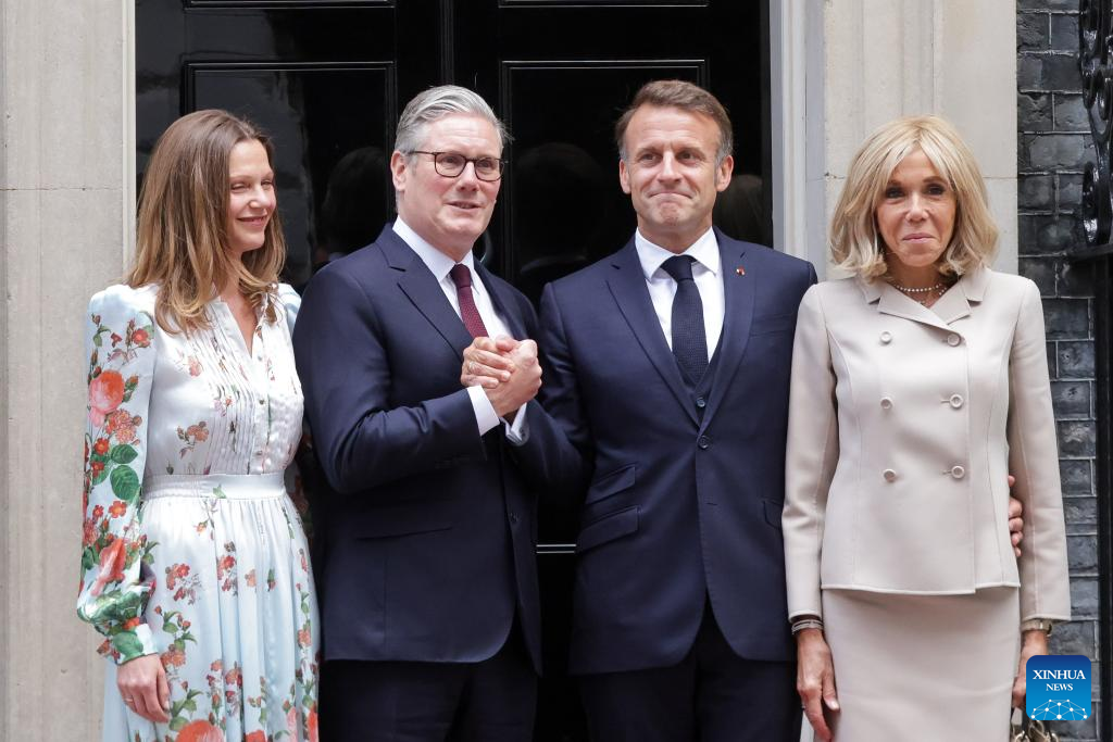 British Prime Minister Keir Starmer (2nd L) and his wife Victoria Starmer (1st L) welcome French President Emmanuel Macron (2nd R) and his wife Brigitte Macron at 10 Downing Street in London, Britain, on July 9, 2025. (Xinhua)