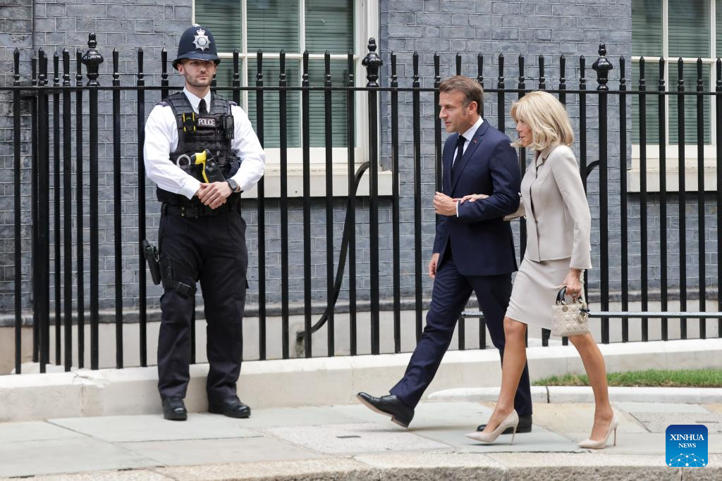 French President Emmanuel Macron (L) and his wife Brigitte Macron arrive at 10 Downing Street in London, Britain, on July 9, 2025. (Xinhua)