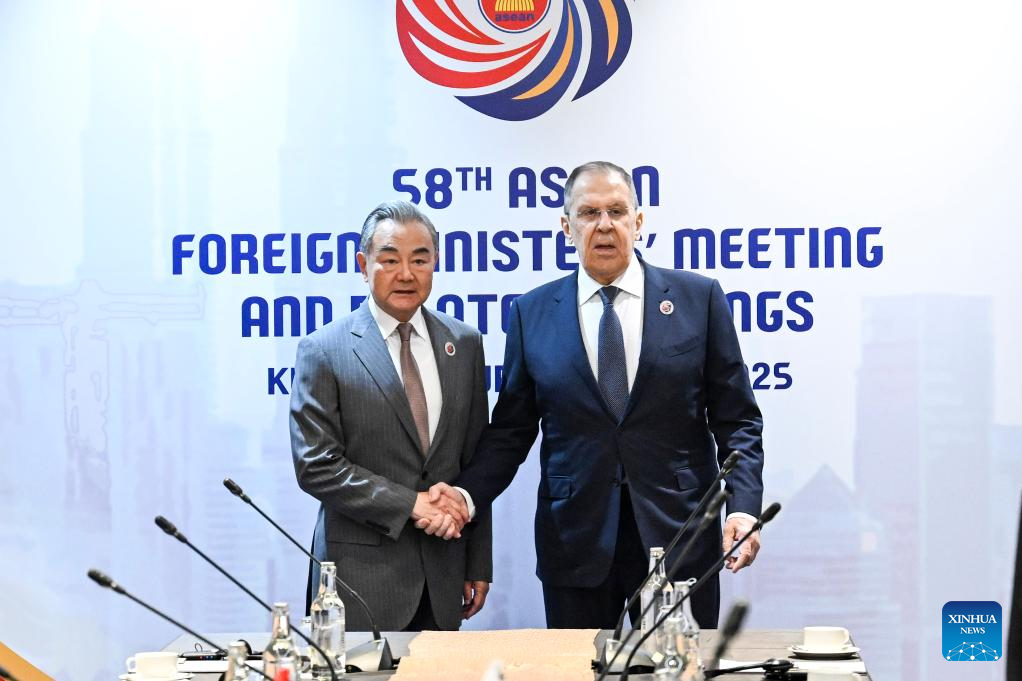 Chinese Foreign Minister Wang Yi, also a member of the Political Bureau of the Communist Party of China Central Committee, meets with Russian Foreign Minister Sergey Lavrov in Kuala Lumpur, Malaysia, July 10, 2025. (Xinhua/Cheng Yiheng)