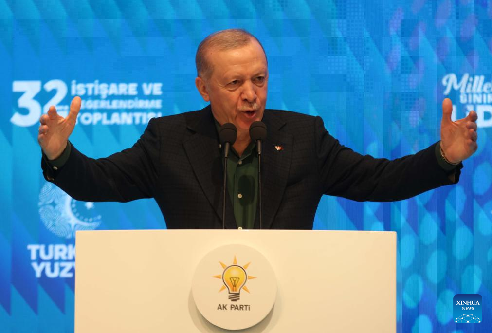Turkish President Recep Tayyip Erdogan speaks during the 32nd Consultation and Evaluation Meeting in Kizilcahamam district, Ankara Province, Türkiye, on July 12, 2025. Turkish President Recep Tayyip Erdogan on Saturday declared "a new page" in history for Türkiye, as the Kurdistan Workers' Party (PKK) begins the disarmament process. (Mustafa Kaya/Handout via Xinhua)