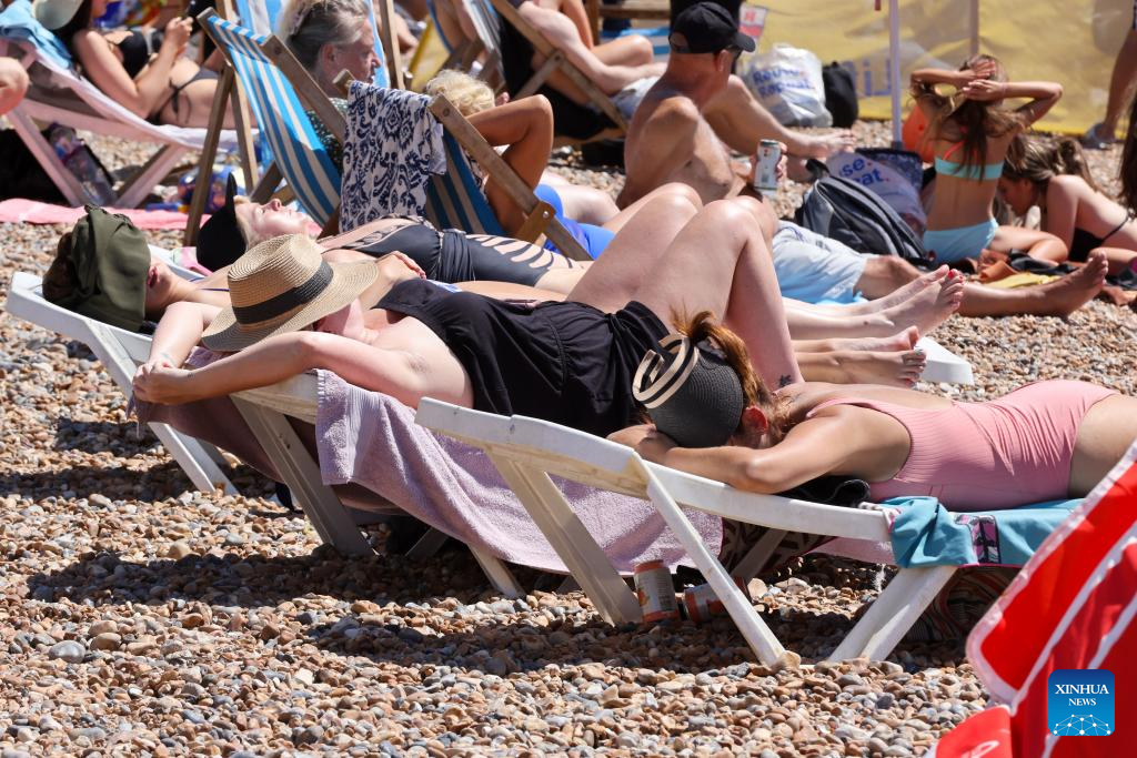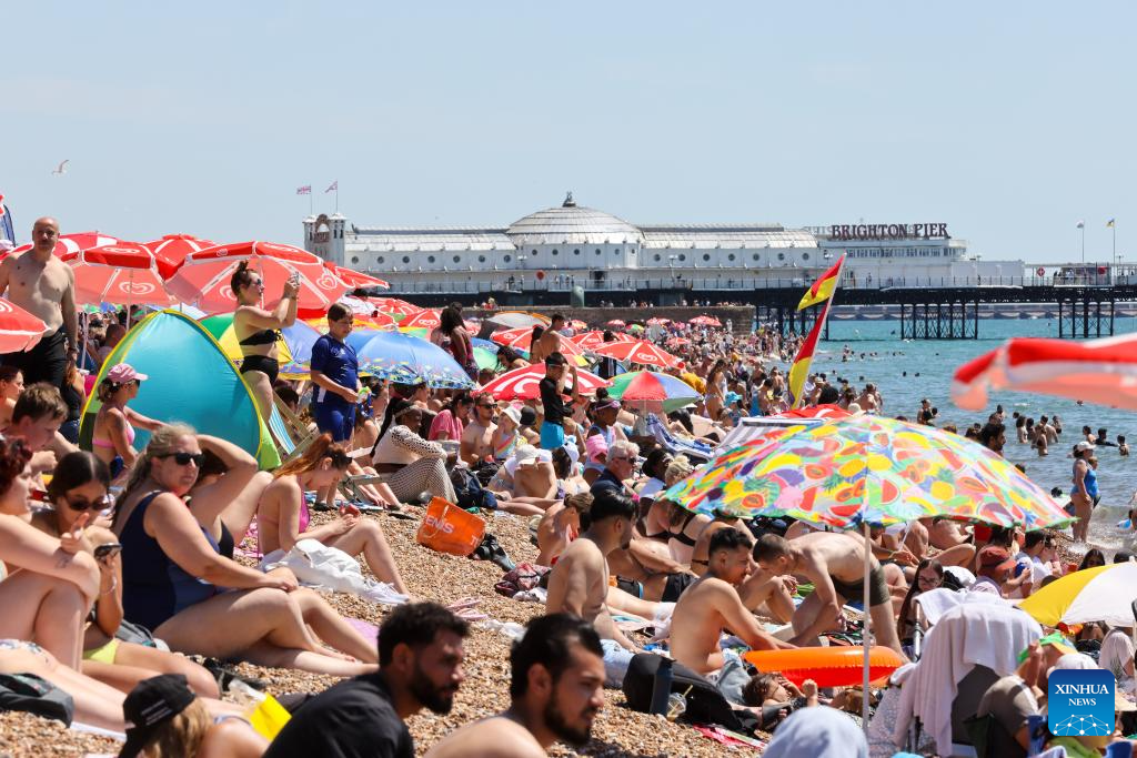 People enjoy their leisure time at the beach of Brighton, Britain, July 12, 2025. Britain is bracing for its third heatwave of the year with exceptionally hot and dry weather conditions prevailing in large parts of the country. (Xinhua)