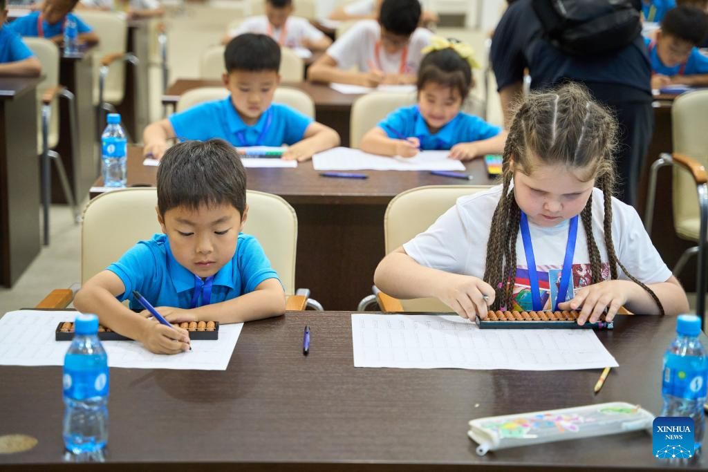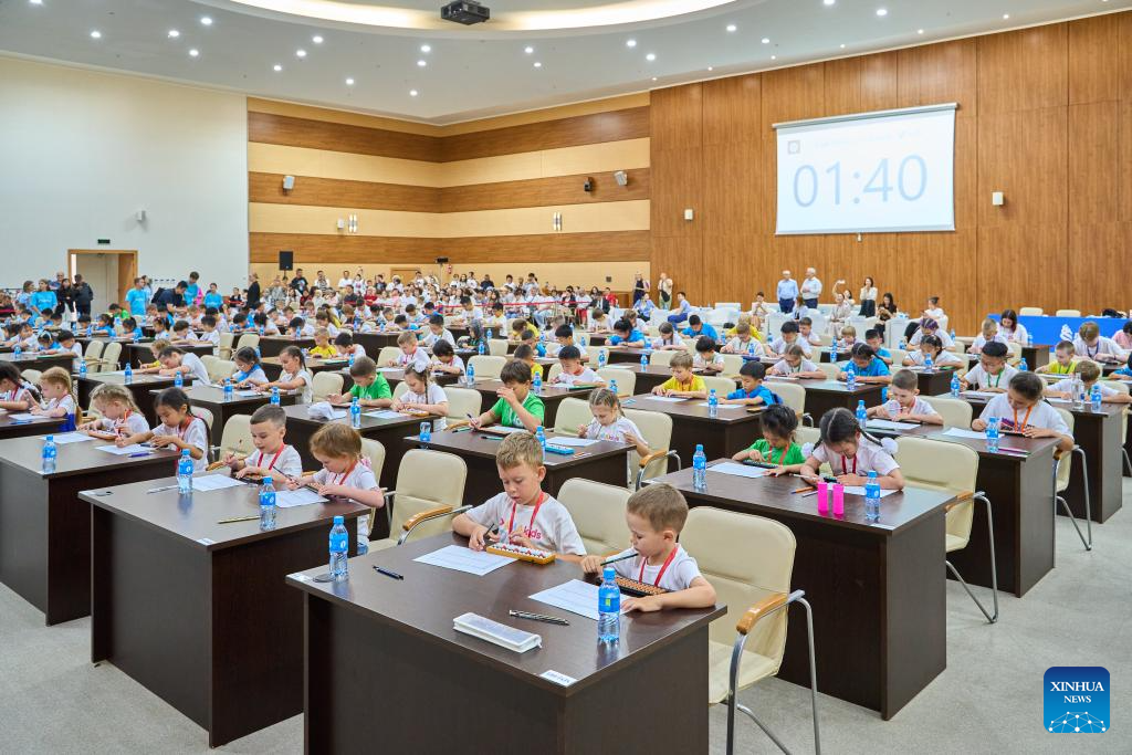 Chinese and Russian pupils participate in an abacus competition in Vladivostok, Russia, July 19, 2025. The "Pacific Cup 2025" International Mental Arithmetic Olympiad was held Saturday in Russia's Far Eastern city of Vladivostok. The competition, organized by Russia's Eastern Association of Mental Arithmetic, brought together 123 primary school students from Russia and China. (Photo by Guo Feizhou/Xinhua)