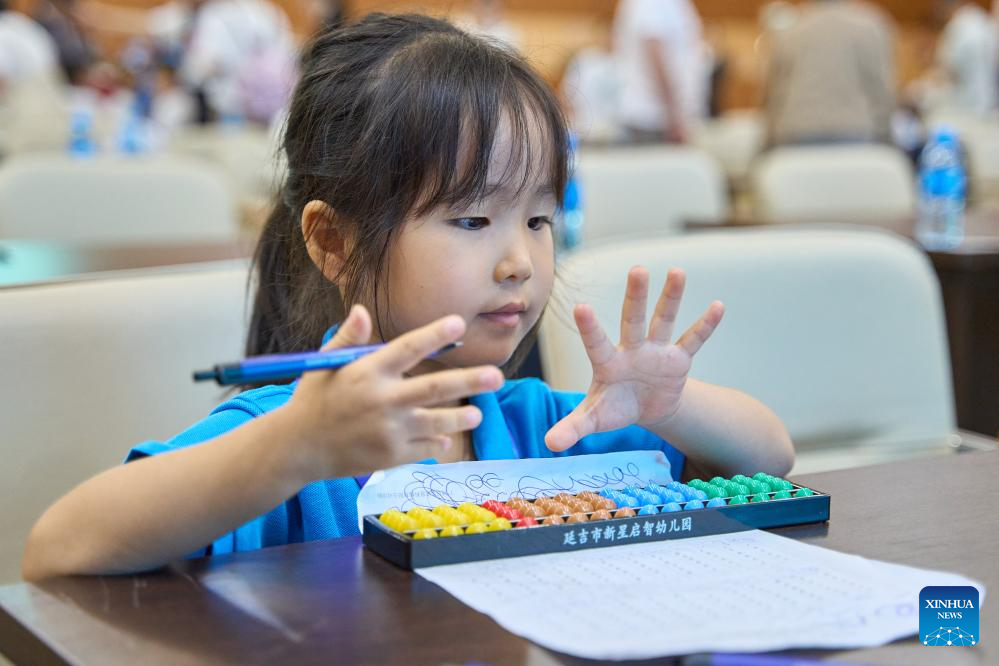 A Chinese girl participates in an abacus competition in Vladivostok, Russia, July 19, 2025. The "Pacific Cup 2025" International Mental Arithmetic Olympiad was held Saturday in Russia's Far Eastern city of Vladivostok. The competition, organized by Russia's Eastern Association of Mental Arithmetic, brought together 123 primary school students from Russia and China. (Photo by Guo Feizhou/Xinhua)
