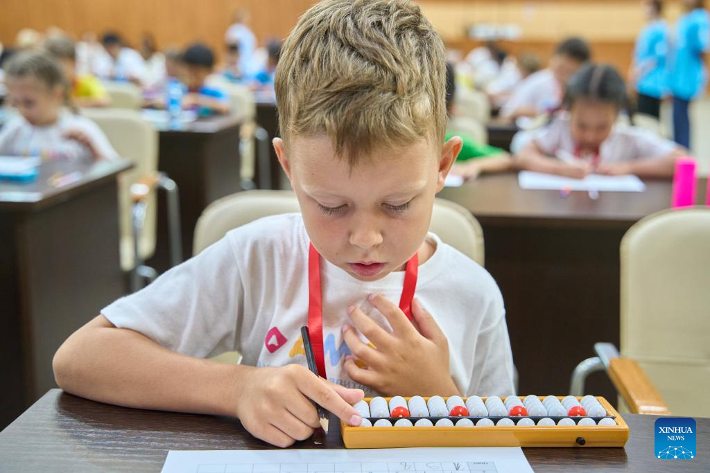 A Russian boy participates in an abacus competition in Vladivostok, Russia, July 19, 2025. The "Pacific Cup 2025" International Mental Arithmetic Olympiad was held Saturday in Russia's Far Eastern city of Vladivostok. The competition, organized by Russia's Eastern Association of Mental Arithmetic, brought together 123 primary school students from Russia and China. (Photo by Guo Feizhou/Xinhua)