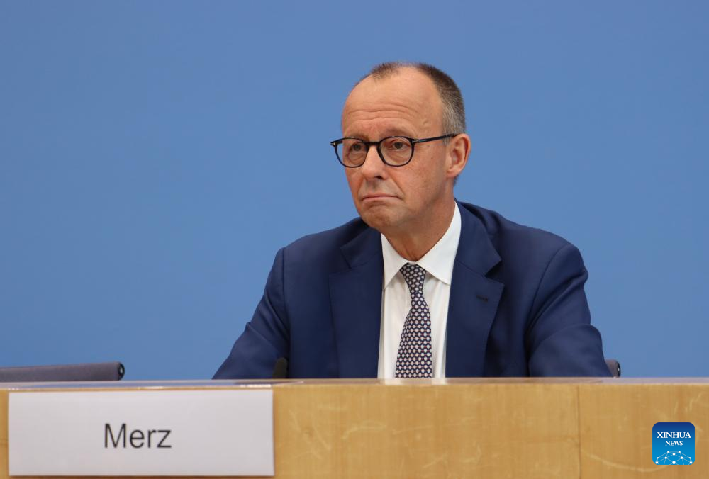 German Chancellor Friedrich Merz reacts during his summer press conference in Berlin, Germany on July 18, 2025. German Chancellor Friedrich Merz on Friday described the current situation in the Gaza Strip as "unacceptable," calling for an immediate ceasefire and comprehensive humanitarian aid for the people there. (Xinhua/Li Hanlin)