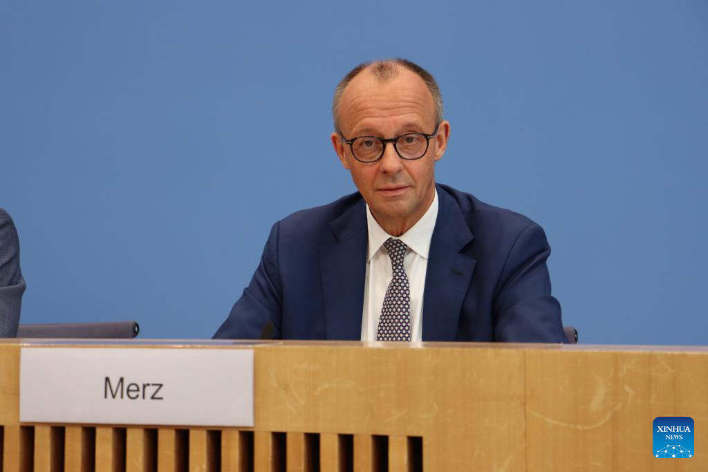 German Chancellor Friedrich Merz speaks during his summer press conference in Berlin, Germany on July 18, 2025. German Chancellor Friedrich Merz on Friday described the current situation in the Gaza Strip as "unacceptable," calling for an immediate ceasefire and comprehensive humanitarian aid for the people there. (Xinhua/Li Hanlin)