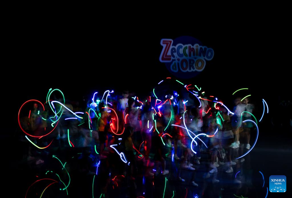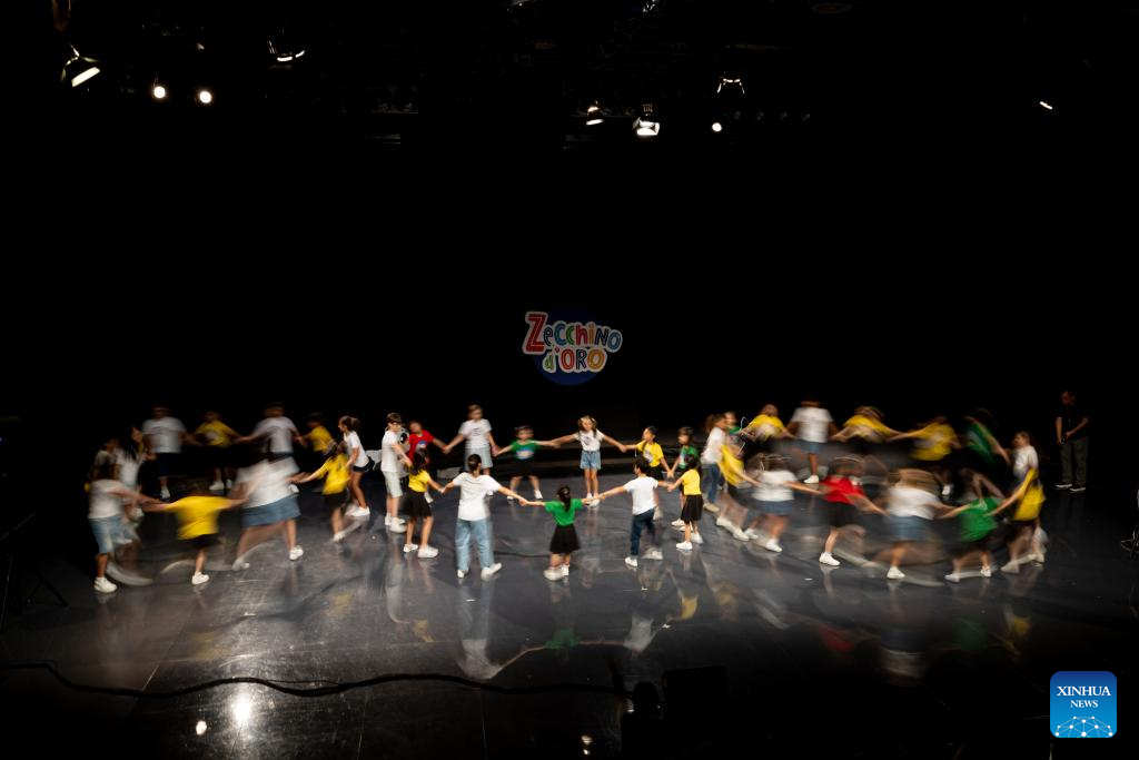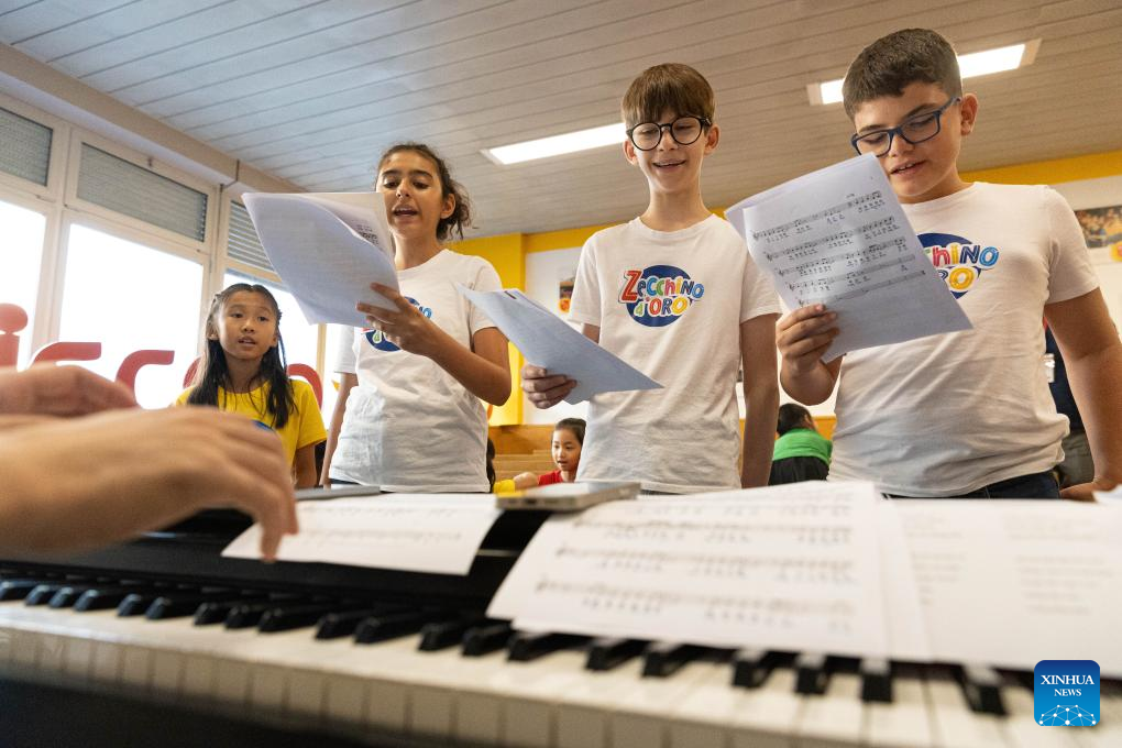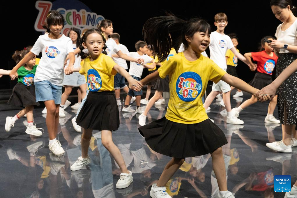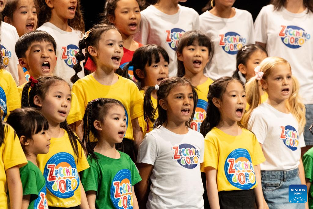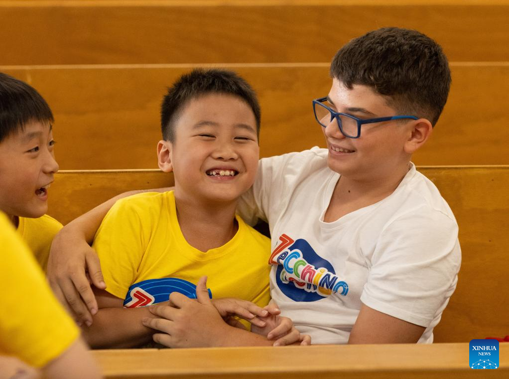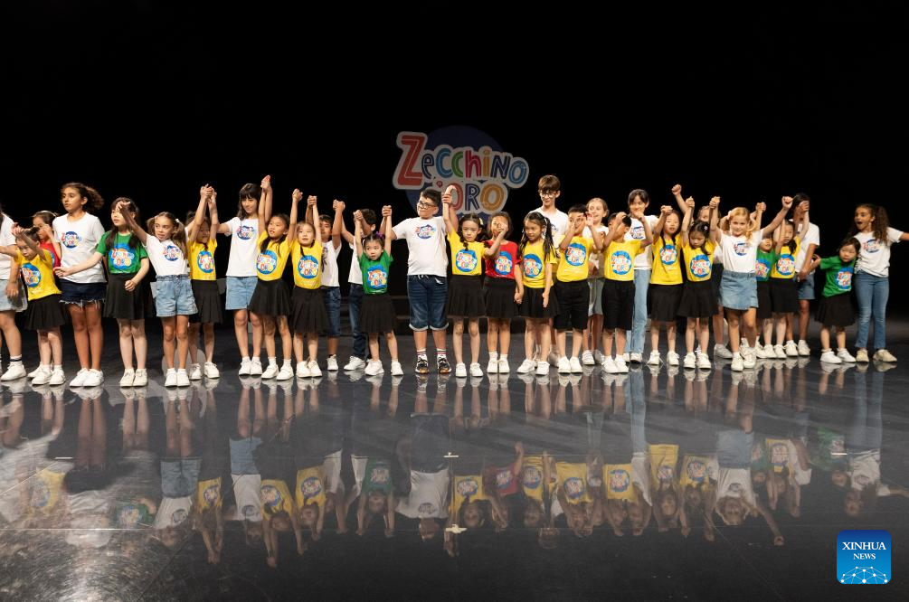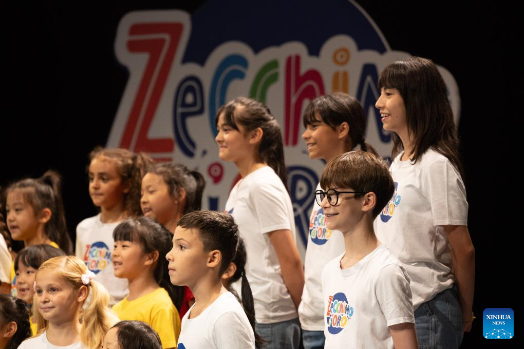 Children from the Hydrangea Children's Choir play at the Antoniano Institute in Bologna, Italy, July 18, 2025. The Antoniano Institute in Bologna hosted a special joint performance on Friday, featuring children from the Little Choir of Antoniano from Italy and the Hydrangea Children's Choir from China. The performance was a highlight of the Antoniano Summer Camp 2025, a ten-day cultural and musical exchange co-organized by the two choirs. Guided by Antoniano's teachers, 22 children from China and their Italian peers connected through rehearsals, music games and hands-on activities. (Xinhua/Li Jing)