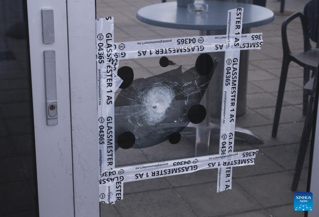This photo taken on July 20, 2025 shows a bullet hole in a glass door of a cafe at the Tveita Center shopping mall in Oslo, the capital of Norway. A shooting incident at a shopping mall in Oslo, capital of Norway on Saturday has left one person hospitalized with gunshot wounds, local police said. (Xinhua/Zhang Yuliang)