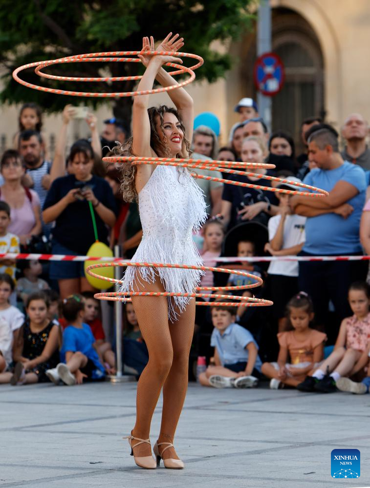 Artists from Bucharest's Metropolitan Circus perform during the "Open Streets - Bucharest, Urban Promenade" on Calea Victoriei, which is closed to vehicle traffic, in downtown Bucharest, Romania, July 19, 2025. The Open Streets event is a cultural programme of Bucharest's townhall that offers live concerts, street shows, parades, dance evenings, creative activities and guided tours during weekends from April 12, 2025 to October 12, 2025. (Photo by Cristian Cristel/Xinhua)