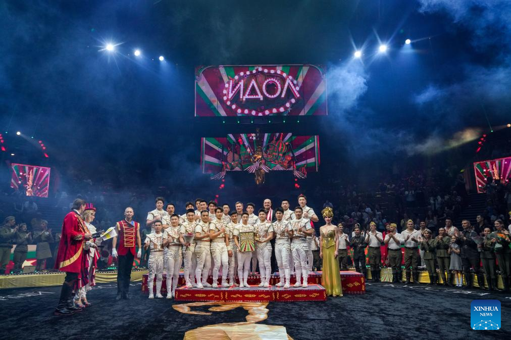 Acrobats from China's Hunan Acrobatic Art Theatre pose for photos during the award ceremony of the World Circus Art Festival "IDOL-2025" in Moscow, Russia, July 20, 2025.