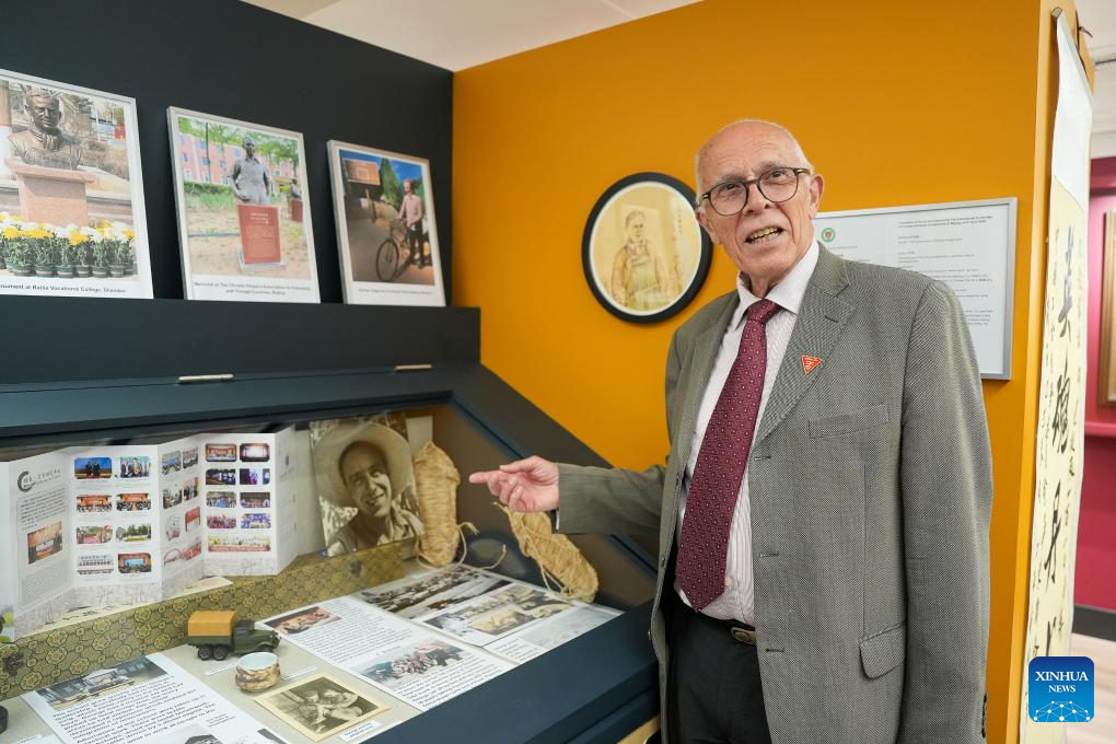 Mark Aylwin Thomas, nephew of late George Hogg, visits an exhibition commemorating George Hogg in Harpenden, Britain, July 22, 2025. An exhibition commemorating George Hogg, a British journalist who dedicated his life to supporting China's war against Japanese aggression decades ago, kicked off here Tuesday. (Xinhua/Wu Lu)